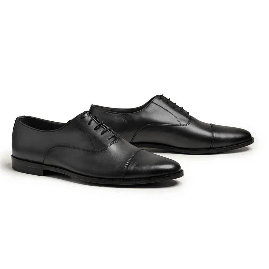 An Oxford shoe is the most classic and formal style of dress shoe, defined by its closed lacing system, where the eyelets are stitched under the vamp for a clean, streamlined look. The silhouette is sleek and structured, typically featuring an almond or rounded toe and minimal detailing.